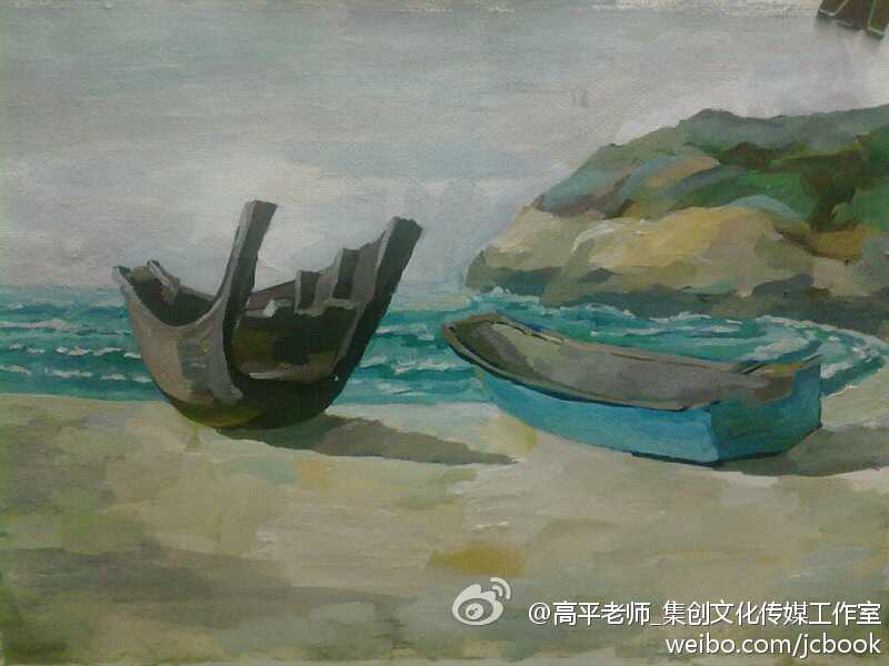图片如下:到海边写生了一下,天气好冷,风又大。刚开始画不久,船被抬到海里去了。图片如下: